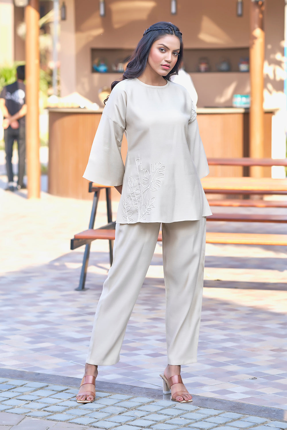 An A-line top with a round neck, bell sleeves, and loose trousers make up the coordinated ensemble. The delicate Dori embroidery is the crowning touch that makes this laid-back look a standout in any collection of summer casual outfits for ladies.