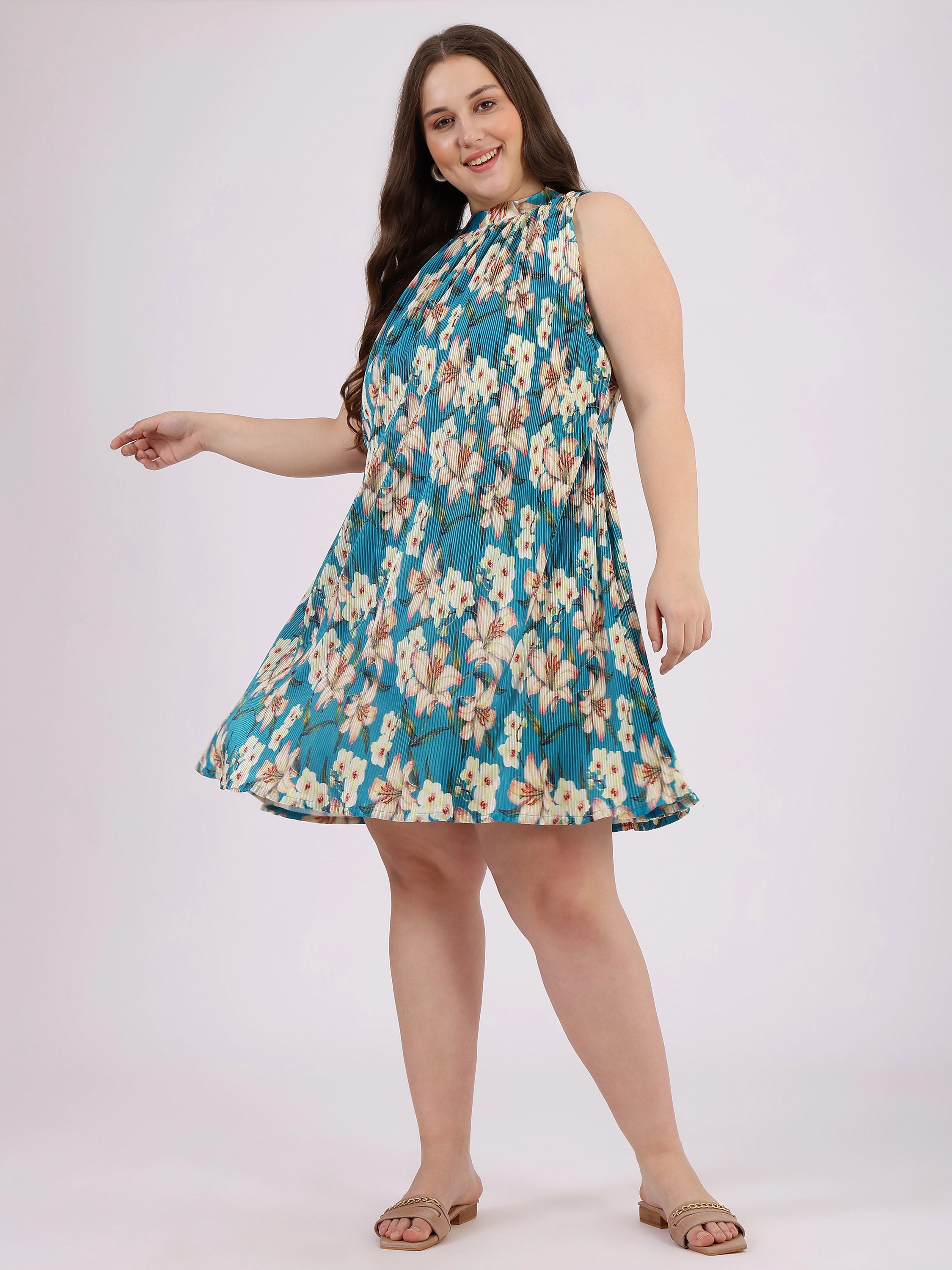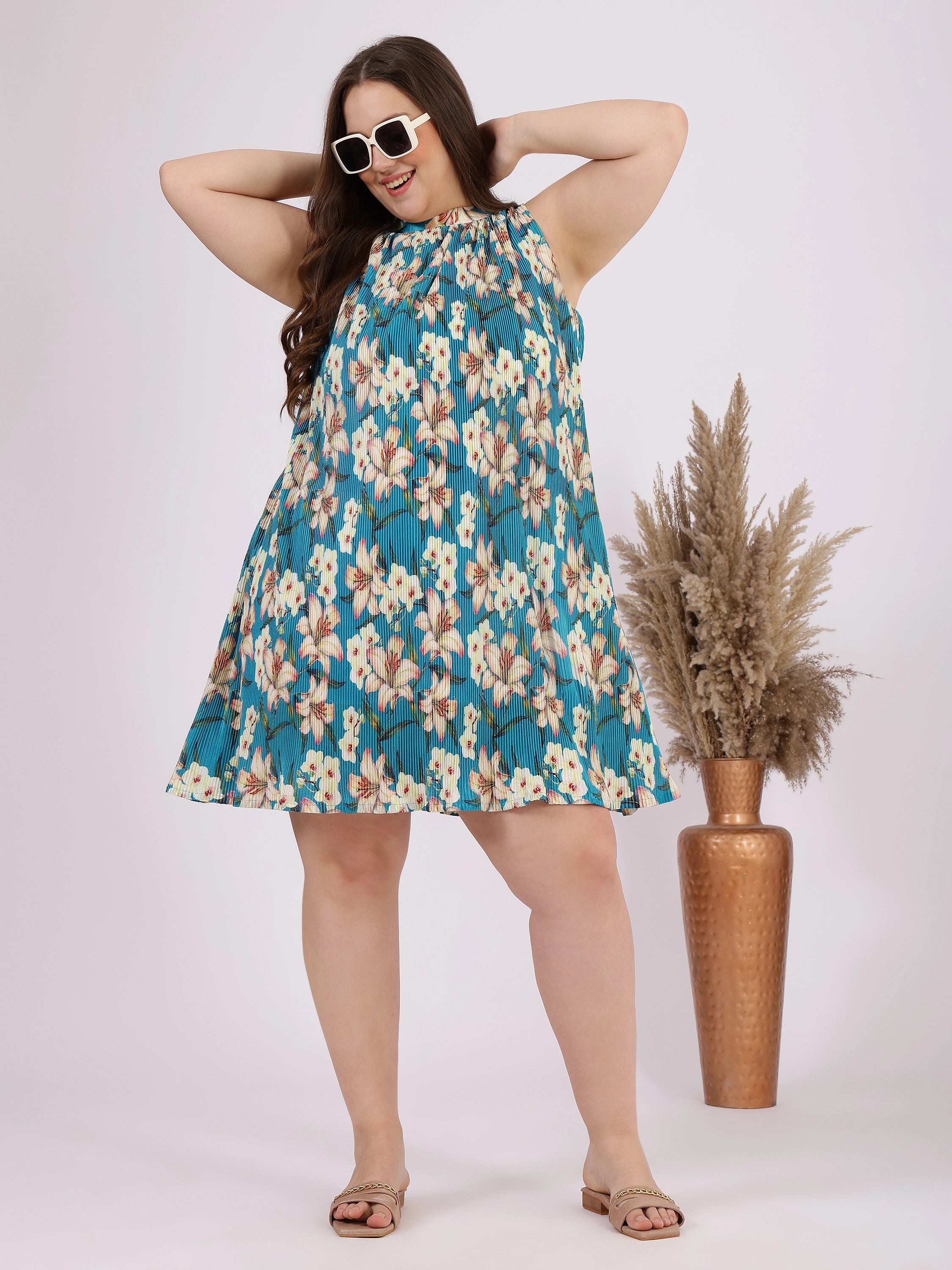 Floral Summer Plus Size A-Line Dress with High Neckline – Teal & Blue Mix